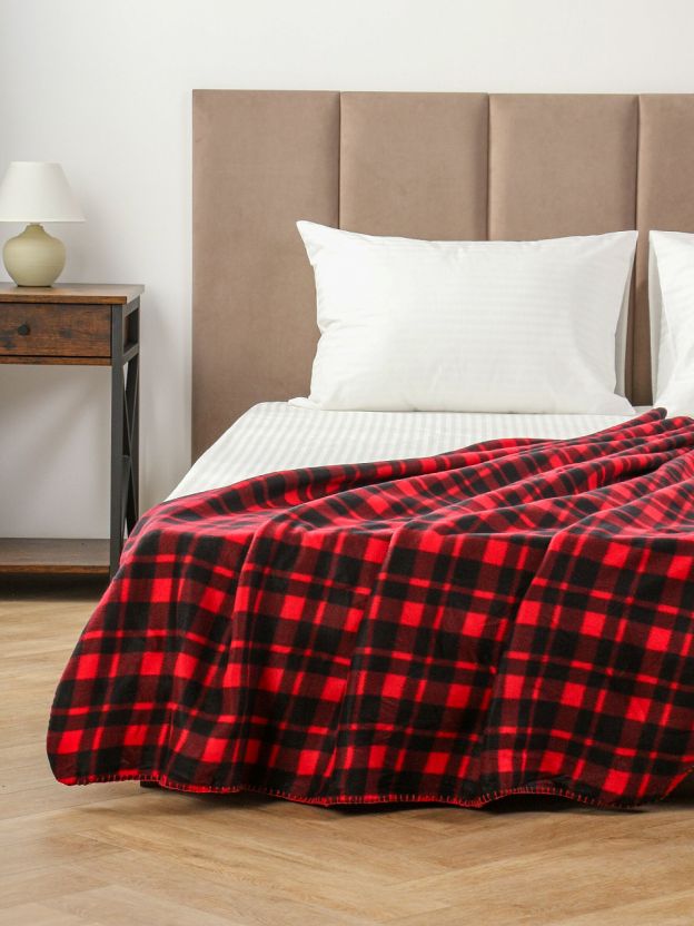 Размер — 130х170 см (1.5-спальный), плотность ткани — 180 г/м2, материал — 100% полиэстер без ворса, двухсторонний, рисунок — клетка.