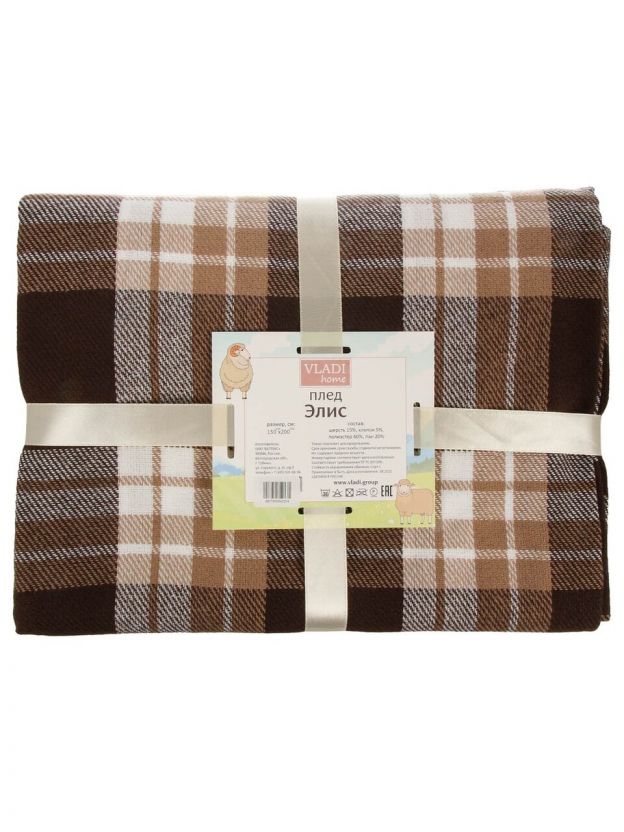 Плед 1.5-спальный, 150х200 см, 15% шерсть, 5% хлопок, 60% полиэстер, 20% ПАН, Vladi, Элис, белый, бежевый, коричневый, рап.4