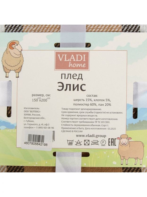 Плед 1.5-спальный Vladi Элис 150x200 см: уют, тепло и стиль для дома и дачи — шерсть, хлопок, двухсторонний дизайн, выгодная цена