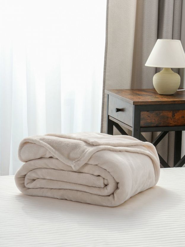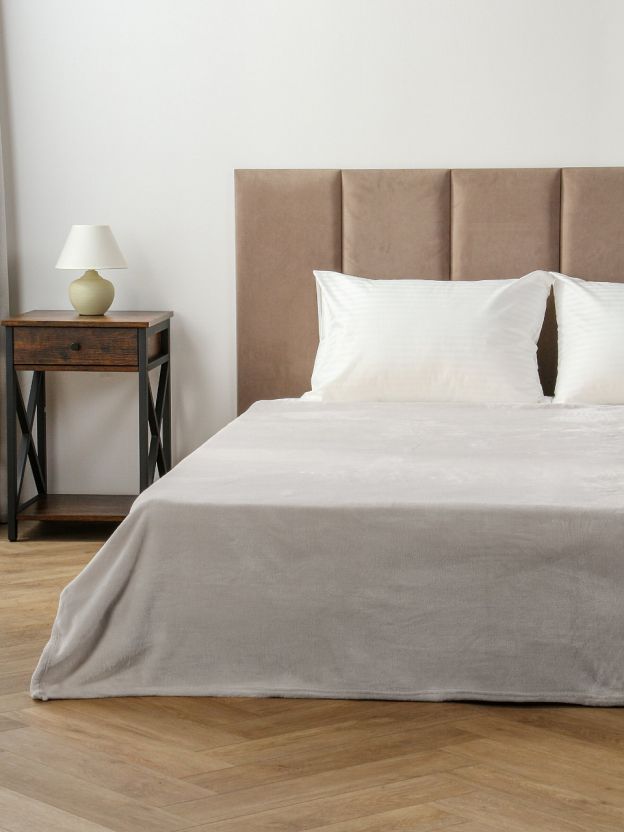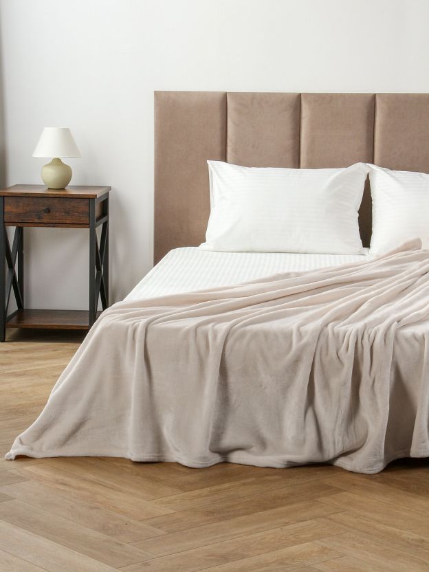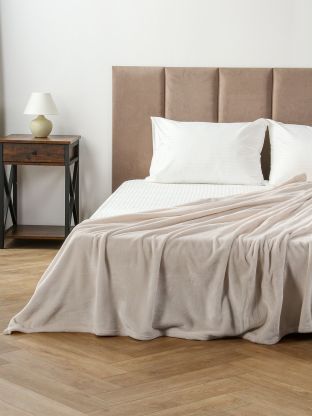 Размер 150х200 см, плотность 280 г/м2, двухсторонний, короткий ворс, без рисунка, не стеганый, легко стирается при 30 градусах, не требует глажки.