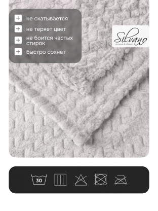 Плед из 100% полиэстера можно стирать в машинке при 30–40°C. Материал сохраняет мягкость и форму даже после многократных стирок.
