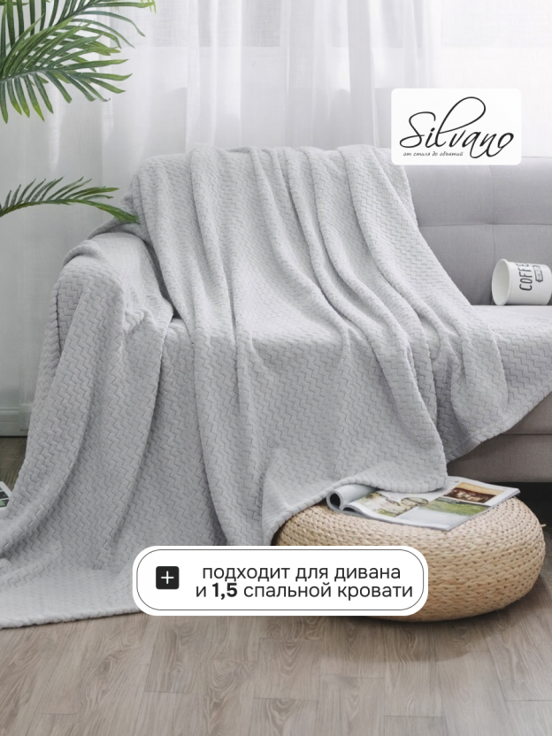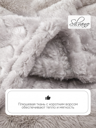 Размер пледа — 180х200 см, что оптимально для двуспальных кроватей, диванов и кресел. Плед не стёганый и не двусторонний, но отлично ложится на любую поверхность.