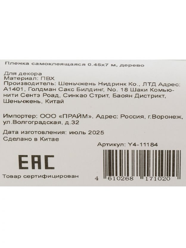 Пленка идет в рулоне шириной 0,45 м и длиной 7 м. Этого достаточно для покрытия мебели, столешниц, дверей или части стены. Материал — винил, рисунок имитирует дерево.