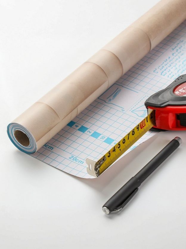 Ширина пленки — 0.45 м, длина рулона — 8 м, толщина — 0.08 мм. Этого достаточно для оклейки фасадов мебели или части стены.
