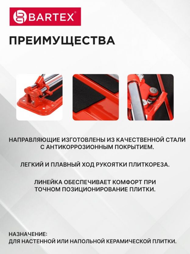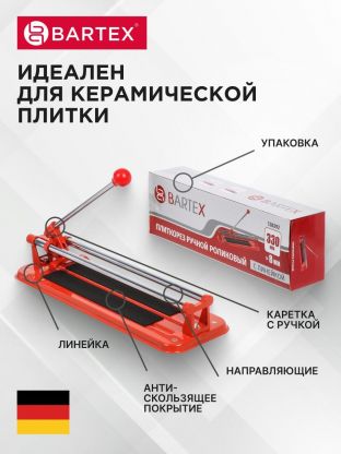 Предусмотреть все нюансы ремонта невозможно. Зачастую, уже в процессе работ, возникают ситуации, где Вам просто необходимо нарезать напольную или настенную плитку нужного размера. На помощь придет ручной плиткорез Bartex. Он производит идеально ровный рез при помощи ролика. Продольное ребро служит для надлома плитки по направляющему каналу.
