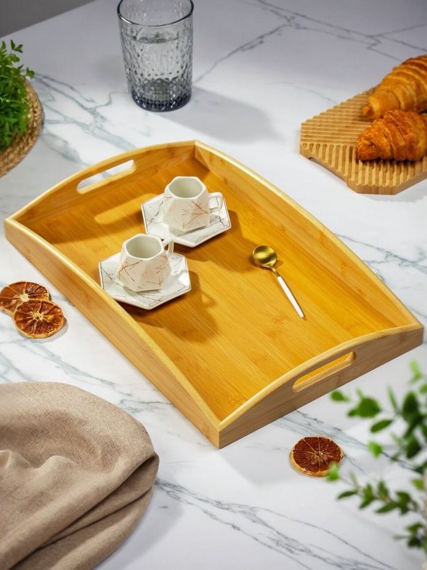 - Экологичный бамбук — лёгкий, прочный и не впитывает запахи, что важно для сервировки еды и напитков