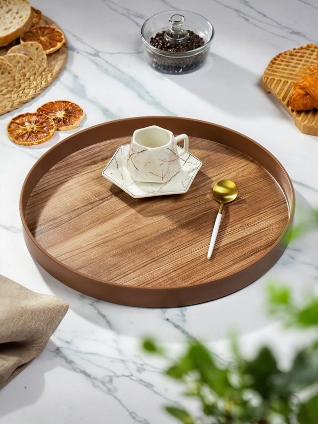 Круглый пластиковый поднос 32 см — практичный выбор для сервировки и подачи напитков, фруктов, закусок. Благодаря бортикам еда и посуда не скользят, а современный коричневый цвет впишется в любой интерьер. Если вы ищете, какой поднос выбрать для дачи или дома, обратите внимание на этот вариант: он лёгкий, не бьётся, легко моется в посудомоечной машине, что особенно удобно для ежедневного использования.