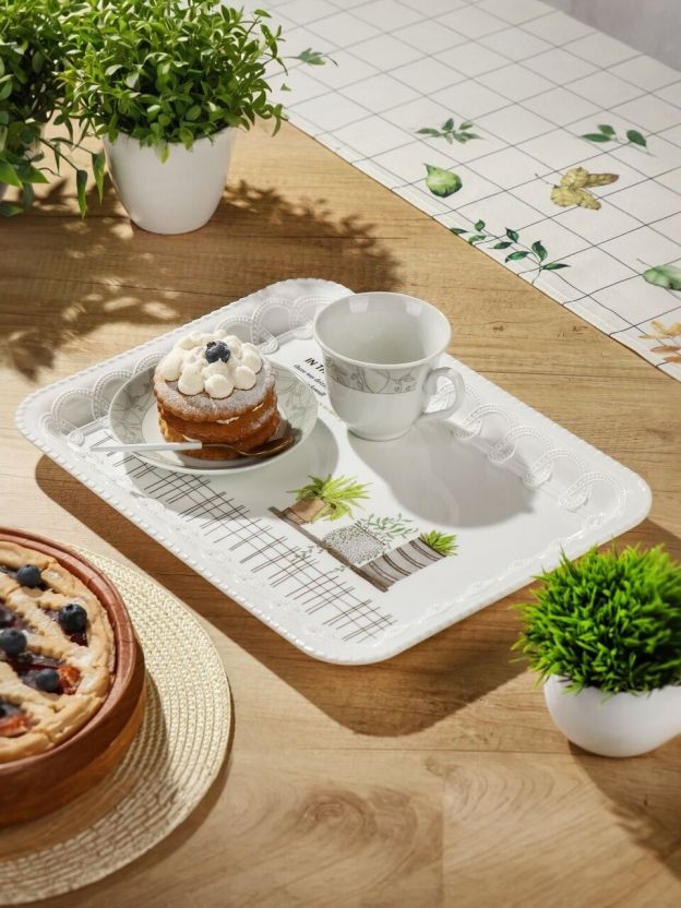 Универсальный поднос из пластика 37х28 см с ручками и рисунком "Весенним утром" — удобно переносить кофе, подавать десерты и сервировать стол без лишних хлопот.
