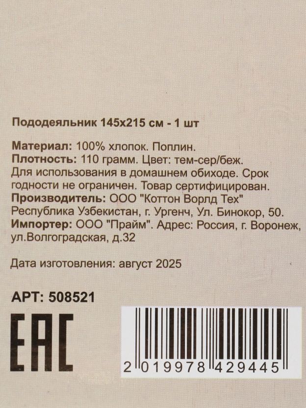 • Размер 145х215 см — подходит для стандартных полутораспальных одеял, легко стирается и быстро сохнет.