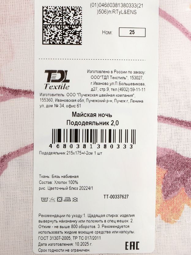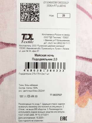 Двуспальный пододеяльник «Майская ночь» выполнен из прочной бязи — это разновидность хлопковой ткани, известная своей износостойкостью и простотой ухода. Такой пододеяльник не выцветает после стирки, быстро сохнет и сохраняет форму. Если вы ищете, какой пододеяльник выбрать для дачи или что лучше для аллергиков, обратите внимание на 100% хлопок: он пропускает воздух и не вызывает раздражений.