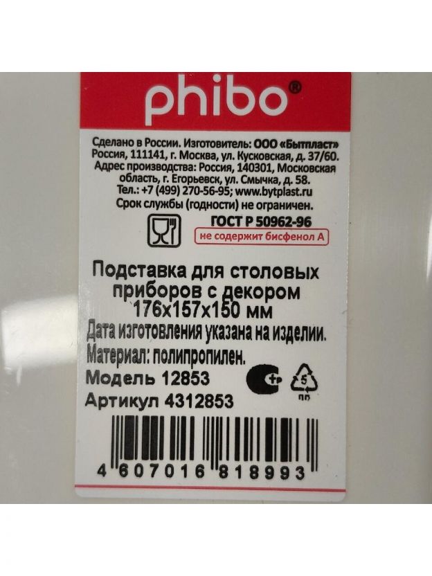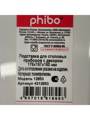 Подставка для столовых приборов, пластик, 17.6х15.7х15 см, с декором в ассортименте, Phibo, 4312853