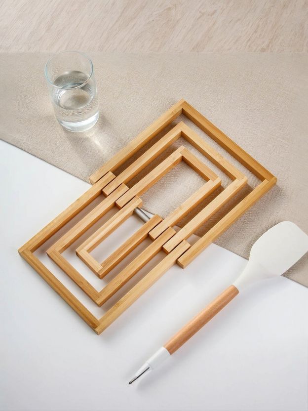 Если вы ищете, чем отличается бамбуковая подставка от обычной деревянной, обратите внимание на структуру материала: бамбук легче, быстрее сохнет и не впитывает запахи. Прямоугольная форма 19х19 см удобна для размещения посуды разных размеров. Как использовать подставку Daniks? Просто разместите её на столе под горячим чайником, кастрюлей или формой для выпечки — поверхность останется чистой и без следов.