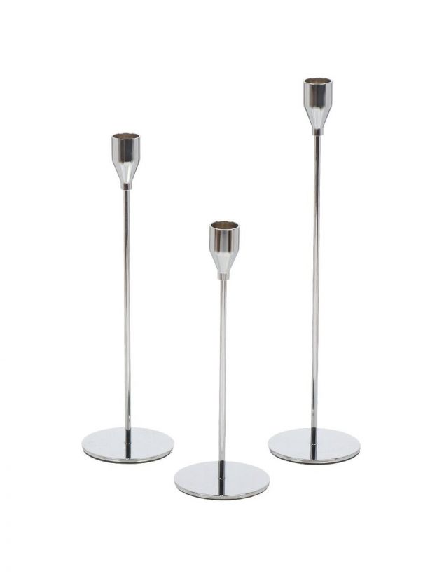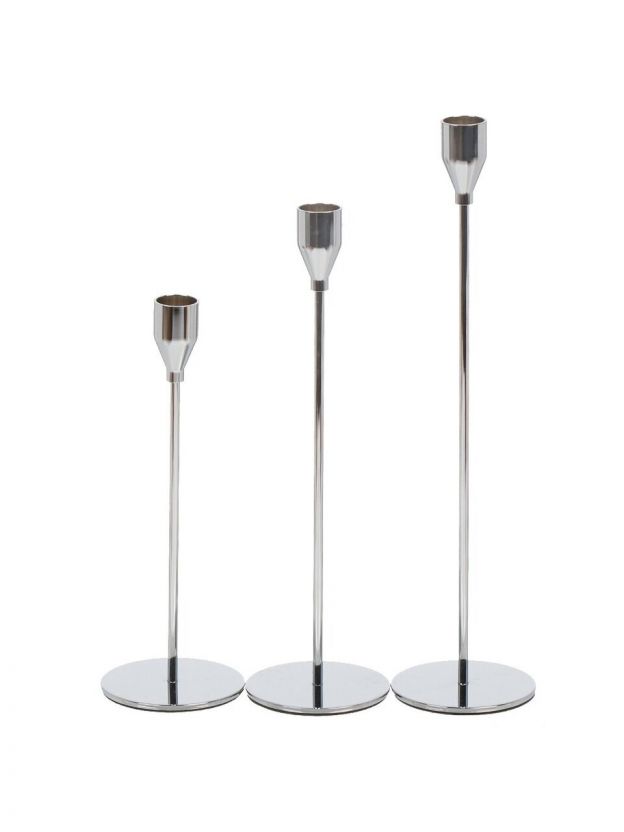 В комплекте три подсвечника высотой 23, 27 и 32 см, диаметр отверстия под свечу — 2 см, цвет — серебристый.