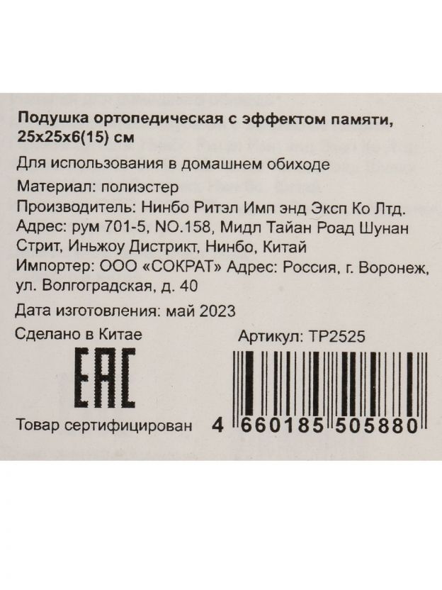 • Размер 25х25х6(15) см, чехол из гипоаллергенного полиэстера, съемная наволочка на молнии для удобства ухода
