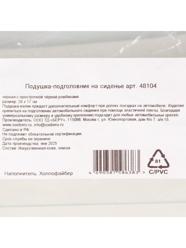 Подушка-подголовник 26х17 см, на сиденье, косточка, Nova Bright, 48104, черная