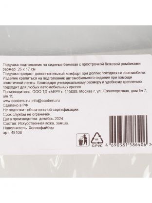 Подушка-подголовник 26х17 см, на сиденье, косточка, Nova Bright, 48106, бежевая