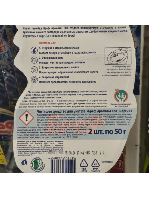 Погрузитесь в атмосферу свежести и чистоты с подвеской для унитаза Бреф "Ароматы СПА Энергия". Это идеальное средство для поддержания гигиены и приятного аромата в туалетной комнате. Эффективная формула обеспечивает длительное действие и гарантирует свежесть после каждого смыва. Преимущества: длительная свежесть; легкость использования; приятный аромат; экономичная упаковка из 2 штук. Произведено в России, что гарантирует высокое качество и надежность.