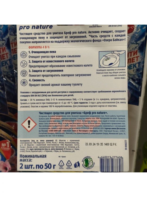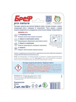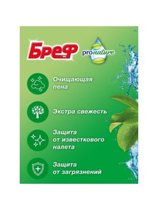 Подвеска для унитаза Бреф Pro Nature — это туалетный блок, который активно очищает и защищает от загрязнений. Создает видимый результат при каждом смывании. Упаковка на 100% пригодна для дальнейшей переработки пластика и картона. Характеристики: Тип: подвеска для унитаза. Количество в упаковке: 2 шт. Аромат: океан. Вес: 2х50 г. Преимущества: Образует очищающую пену, которая обеспечивает гигиеническую чистоту. Предотвращает образование известкового налета. Помогает избежать повторных загрязнений. Подвеска Бреф поможет Вам поддерживать чистоту в туалете без особых усилий. Она наполнит помещение свежим ароматом и защитит поверхность унитаза от образования налета, избавляя Вас от необходимости регулярной гигиенической уборки туалета.