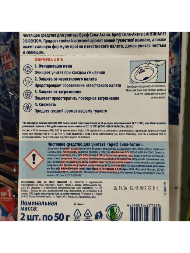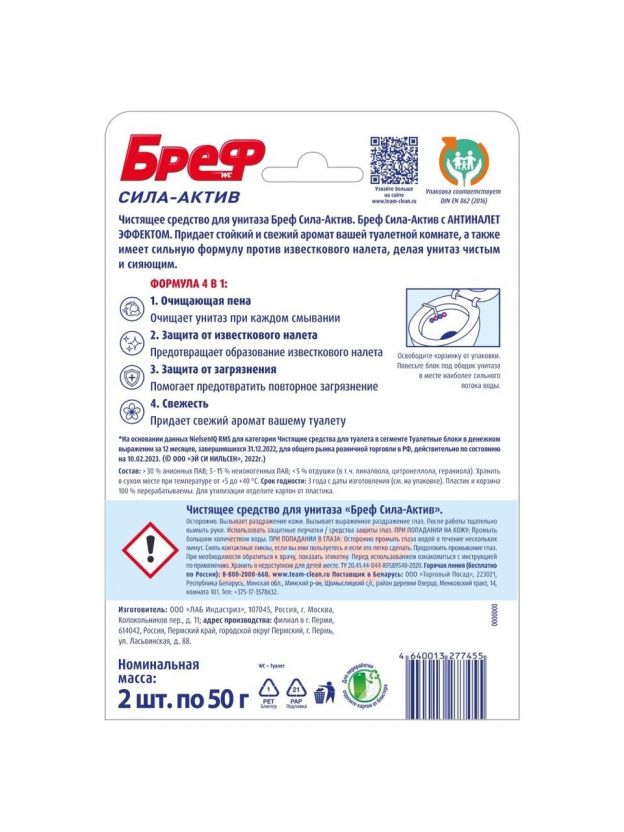 Подвеска для унитаза Бреф Сила-Актив – это подвесной туалетный блок с формулой против известкового налета. Средство создает видимый результат при каждом смывании.