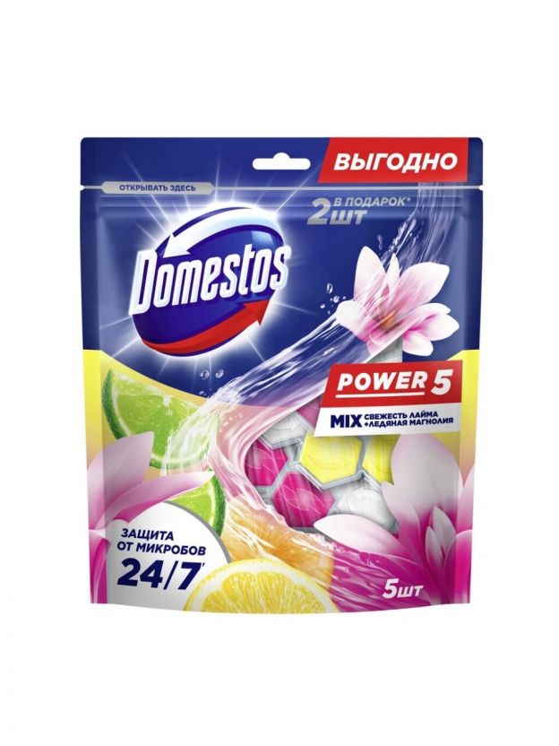 Подвеска для унитаза Domestos, Свежесть лайма и Ледяная магнолия, 5 шт, 50 г, Power 5