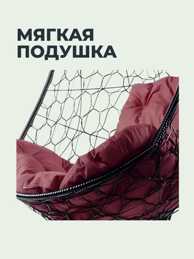 Кресло выполнено в элегантном черном цвете, который гармонично впишется в любой интерьер и подчеркнет его стиль. Бордовая подушка из оксфорда 600 добавляет яркий акцент, придавая изделию изысканность и утонченность. Конструкция из прочного металла обеспечивает устойчивость и надежность, гарантируя долгий срок службы. Кресло-яйцо — это не только стильный элемент декора, но и функциональная мебель, которая подарит минуты безмятежного отдыха.