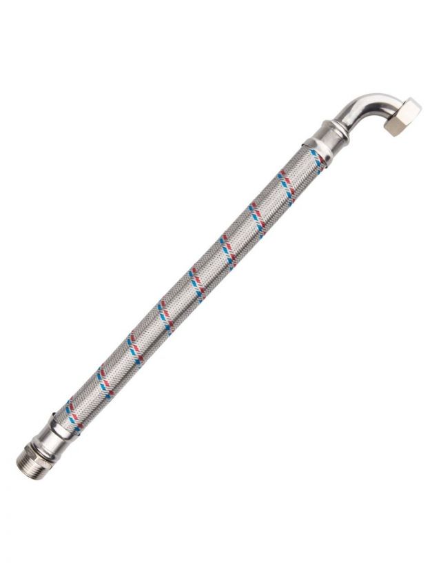 Материал оплетки — нержавеющая сталь, обеспечивающая дополнительную защиту от коррозии и механических повреждений. Материал гайки и штуцера — никелированная латунь, что гарантирует высокую прочность соединения и долгий срок службы. Угловая форма конструкции позволяет легко монтировать подводку даже в ограниченном пространстве, обеспечивая компактность и аккуратность установки.