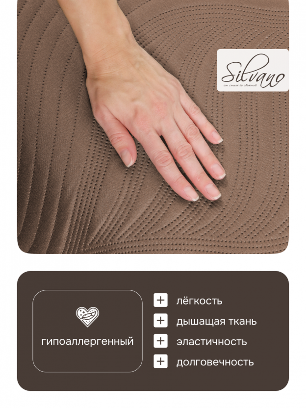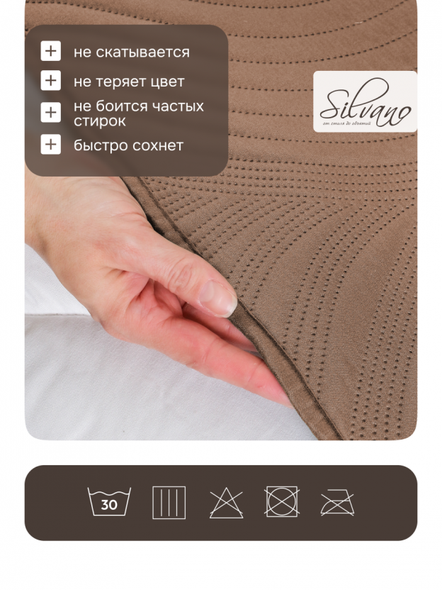 В отличие от аналогов из хлопка или смешанных тканей, данная модель не теряет цвет после стирки, не требует глажки и сохраняет аккуратный вид. Покрывало подойдет для ежедневного использования, поездок на дачу или в качестве стильного подарка. Как использовать покрывало Silvano? Просто расстелите его на кровати или диване — оно не соскальзывает и защищает мебель от загрязнений. Подходит ли для лета? Да, полиэстер обеспечивает оптимальный микроклимат и не перегревает.