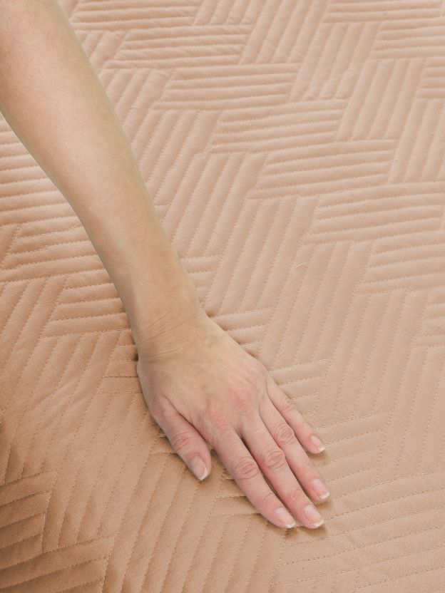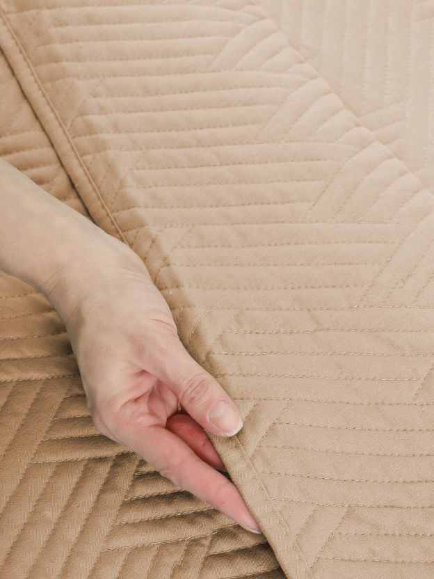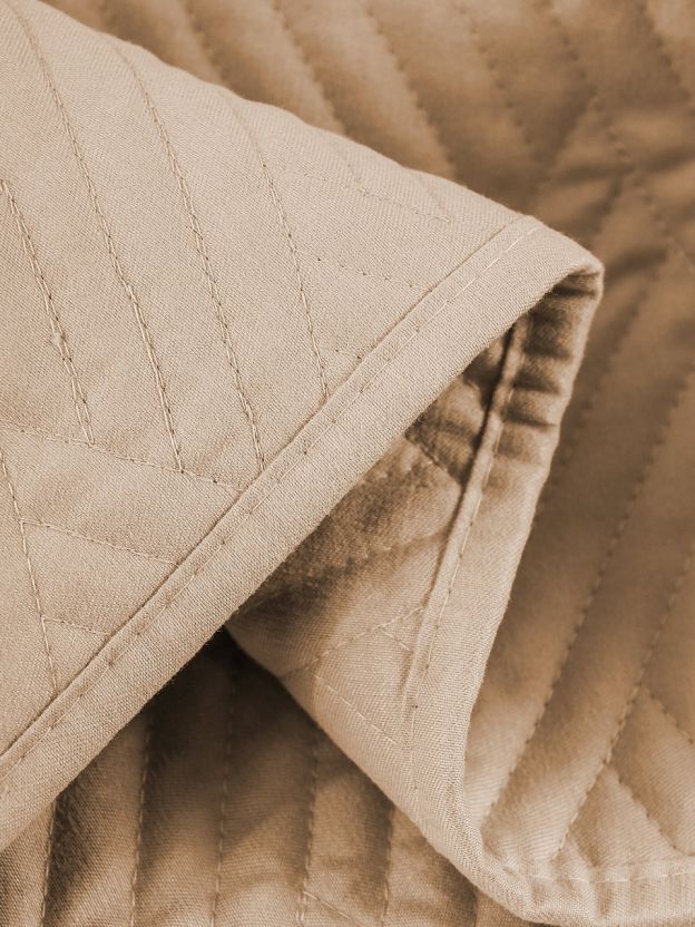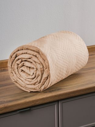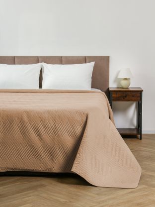 Покрывало выполнено в современном минималистичном стиле, однотонное, цвет кофе с молоком (коричневый), подходит для большинства интерьеров.
