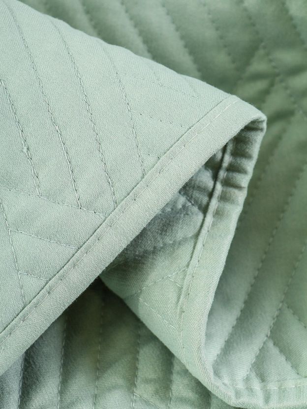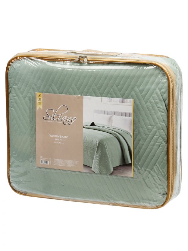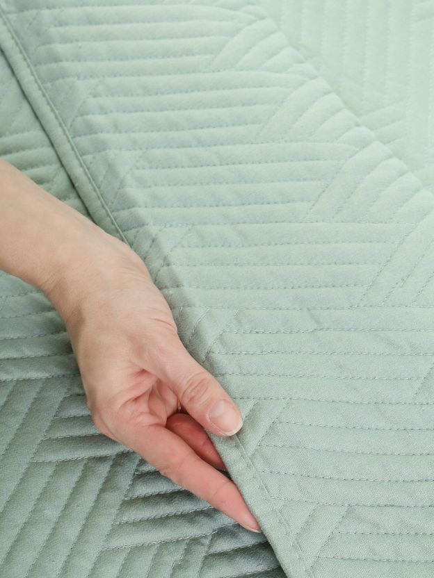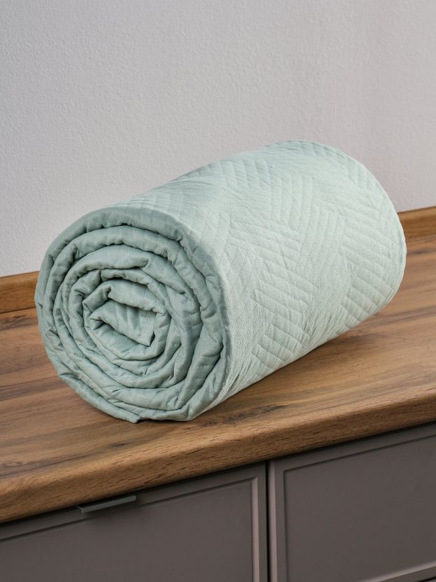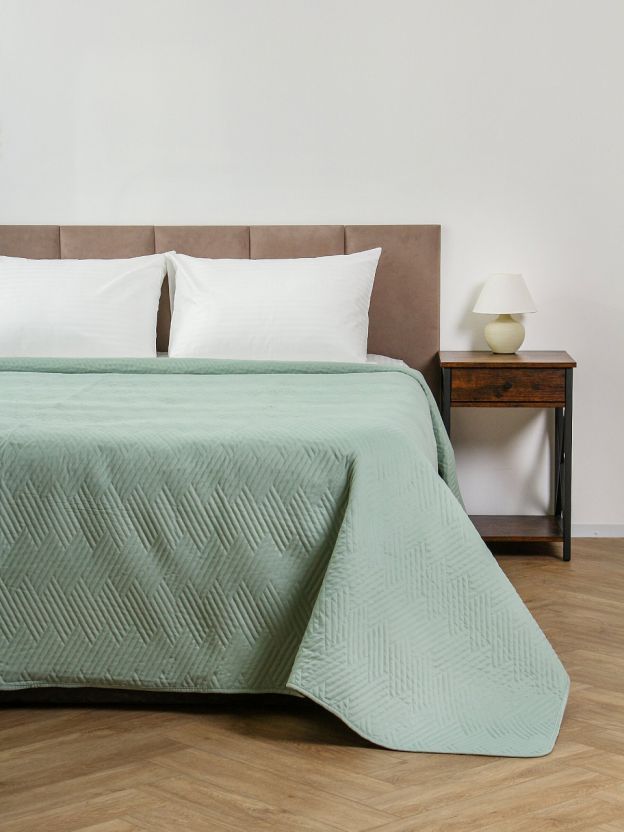 Покрывало выполнено из 100% полиэстера, стеганое, однотонное, не двустороннее, размер 240х260 см, цвет серо-мятный, стиль — минимализм.