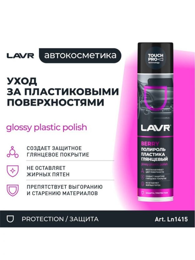 Полироль не только улучшает внешний вид поверхностей, но и предотвращает их выцветание и старение. Средство обладает приятным ягодным ароматом, который оставляет в салоне ощущение свежести и чистоты.