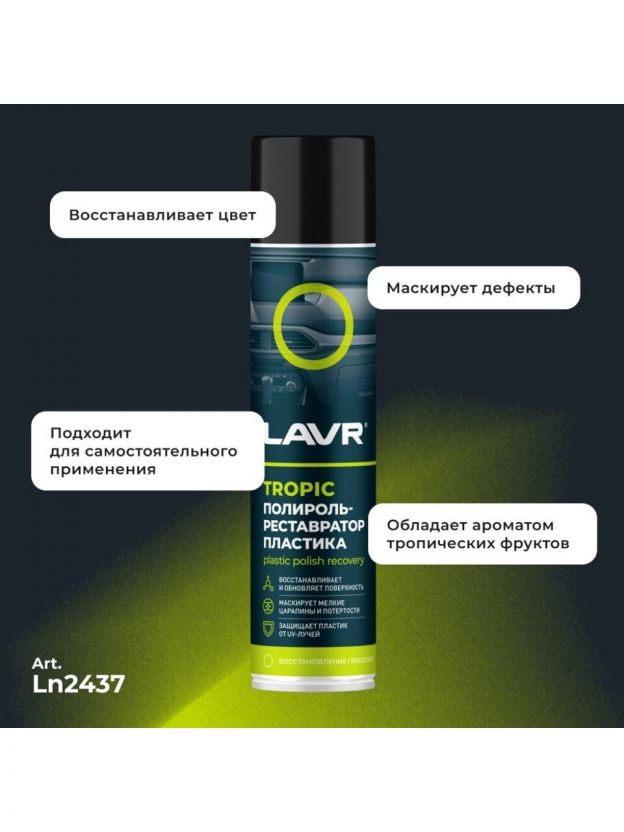Откройте для себя идеальное решение для обновления пластиковых поверхностей с полиролем-реставратором пластика Tropic от Lavr. Этот аэрозоль объемом 400 мл создан специально для ухода за пластиком, обеспечивая ему свежий и ухоженный вид. Продукт от известного бренда Lavr гарантирует высокое качество и надежность.
