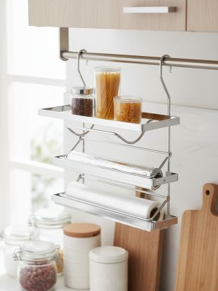 Навесной держатель для бумажных полотенец, фольги, или пищевой пленки выполнен из металла. Он устойчив к механическим повреждениям и пару, легко моется. Такой держатель отлично подойдет к интерьеру вашей кухни. Держатель устанавливается на рейлинг с помощь двух крючков.