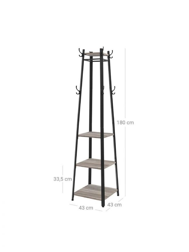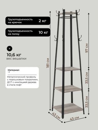 Полка-стеллаж 43х43х181 см из стали: компактное решение в стиле лофт для хранения одежды и аксессуаров, выдерживает до 10 кг, 8 крючков для максимального удобства.