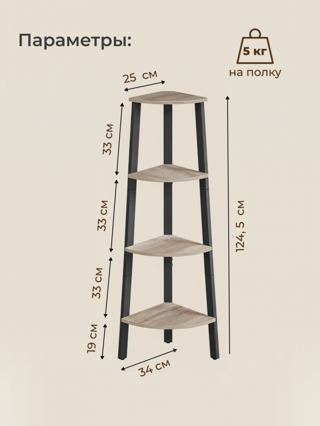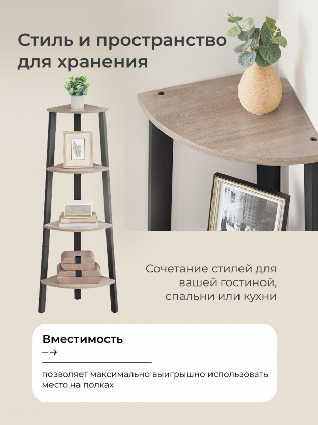 4-уровневые открытые полки: веерообразные полки обеспечивают достаточно места, в то же время полностью используя угловое пространство, что идеально подходит для хранения любых предметов, которые вы хотите показать.