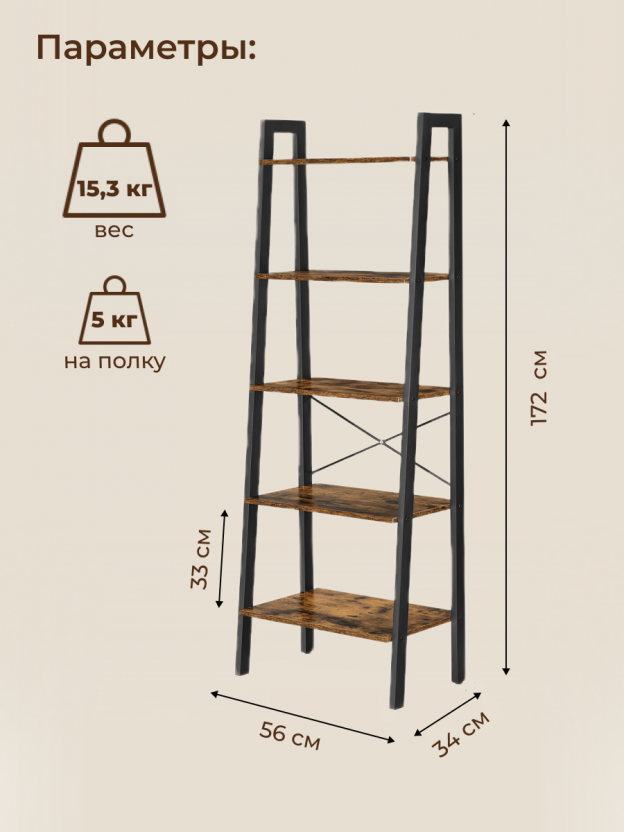 Полка-стеллаж универсальный, ДСП+сталь, 5 секций, 56х34х172 см, Лофт, LLS45X