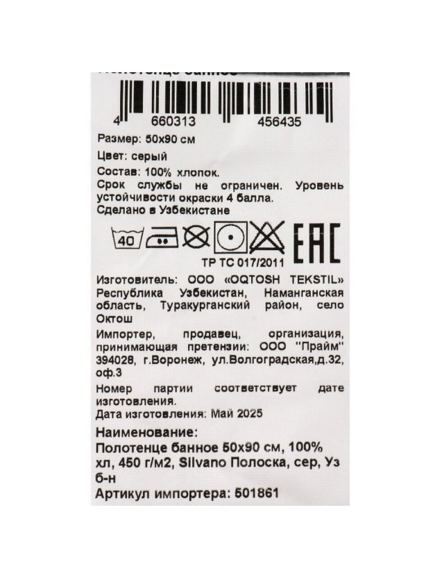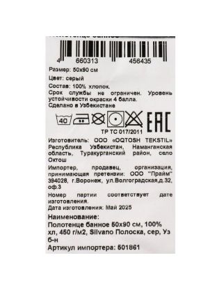 Плотность полотенца — 450 г/м2, махровая фактура. Это обеспечивает прочность, мягкость и отличное впитывание влаги.