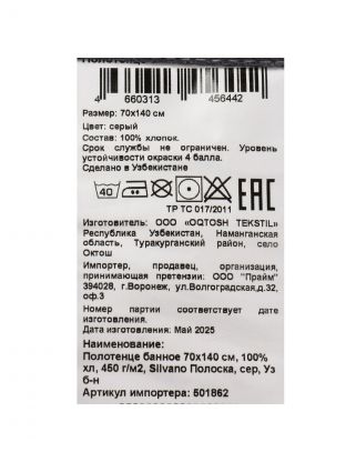 По сравнению с синтетическими аналогами хлопковое полотенце лучше впитывает влагу и не вызывает раздражения. Серый цвет и лаконичный рисунок в полоску впишутся в любой интерьер ванной. Подходит ли для подарка? Да, универсальность стиля делает его уместным выбором для 23 февраля, дня рождения, Нового года или 14 февраля. Как использовать: для лица, рук, тела, а также в спортзале или на даче.