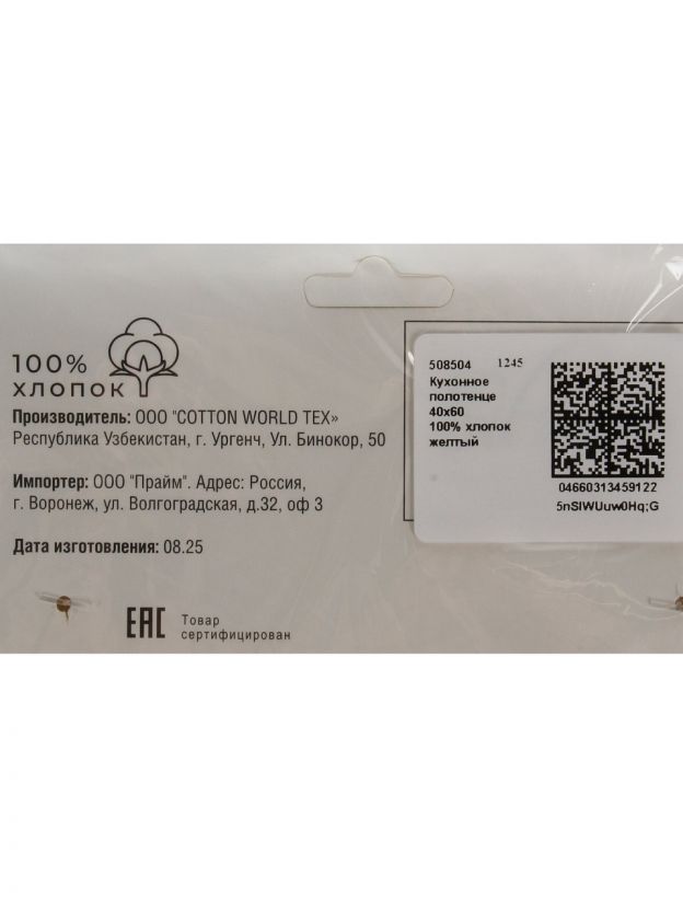 Полотенце кухонное 40х60 см, 100% хлопок, желтая клетка, Узбекистан, Узбекистан