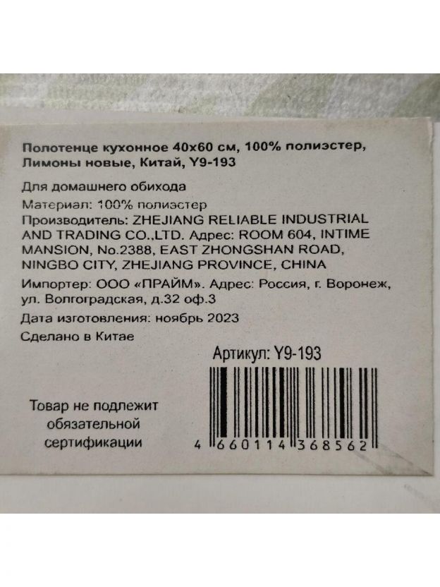 Полотенце кухонное 40х60 см, 100% полиэстер, Лимоны новые, Китай, Y9-193