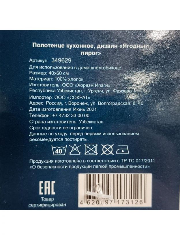 Полотенце кухонное 40х60 см, 200 г/м2, 100% хлопок, Silvano, Ягодный пирог, Узбекистан, 100033