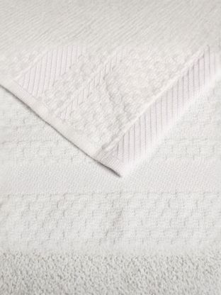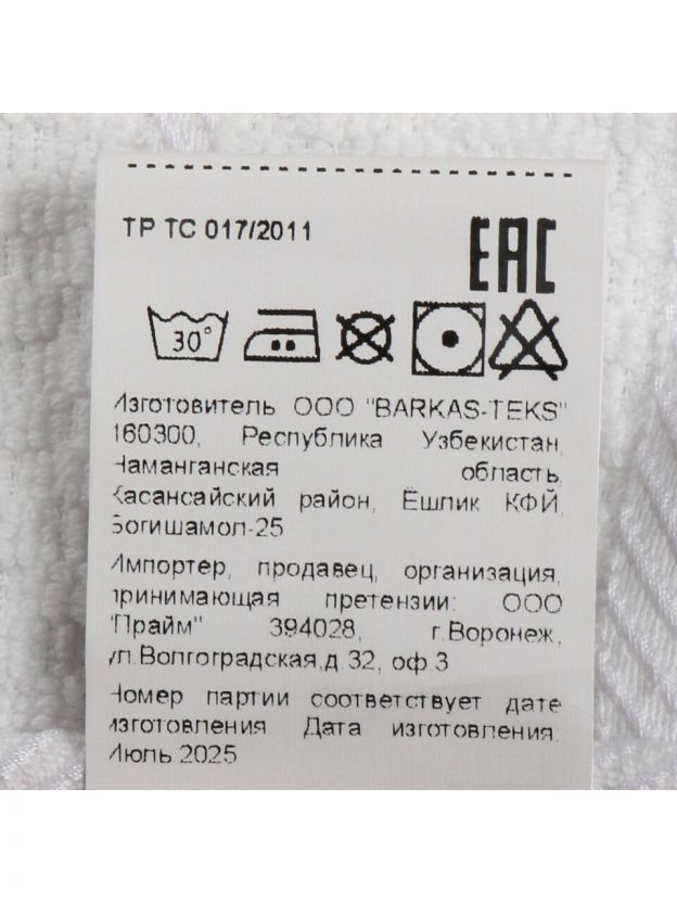 Полотенце выполнено из 100% хлопка плотностью 400 г/м2, произведено в Узбекистане. Белый цвет, махровая текстура, прочные швы.