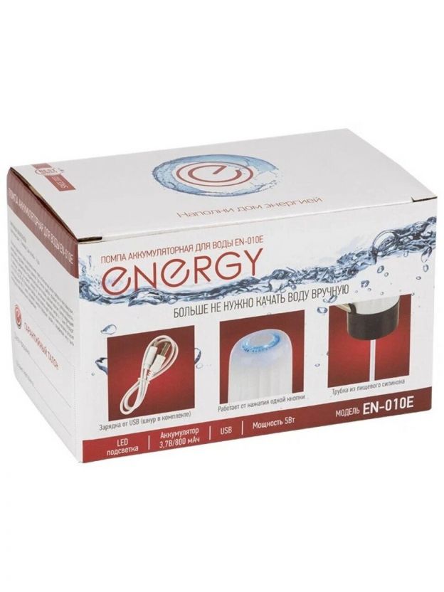 Перезаряжаемая помпа ENERGY EN-010E работает от нажатия одной кнопки. Модель снабжена металлическим носиком и прозрачной трубкой для подачи воды, изготовленной из пищевого силикона. Помпа со встроенной подсветкой работает от аккумулятора который заряжается при помощи USB-кабеля.