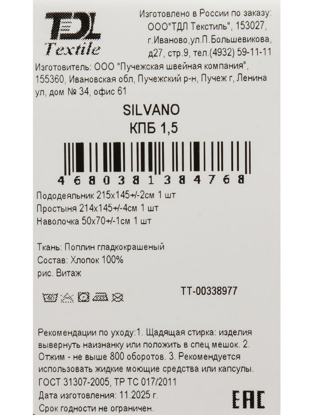 Какой размер у пододеяльника и простыни в комплекте Silvano «Витаж»?