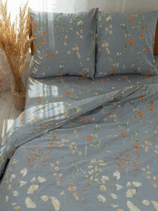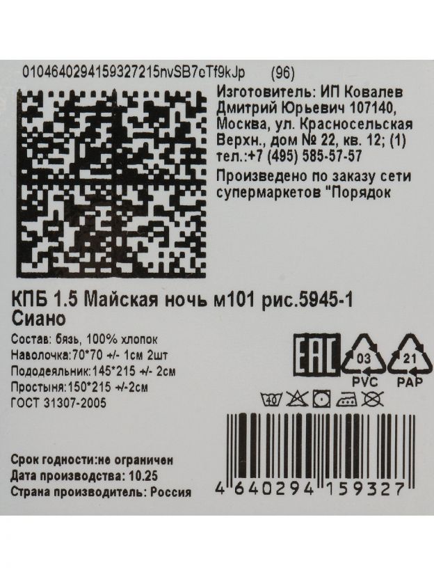 Простыня — 150x215 см, пододеяльник — 145x215 см, наволочки — 70x70 см. Комплект рассчитан на 1,5-спальную кровать стандартных габаритов.