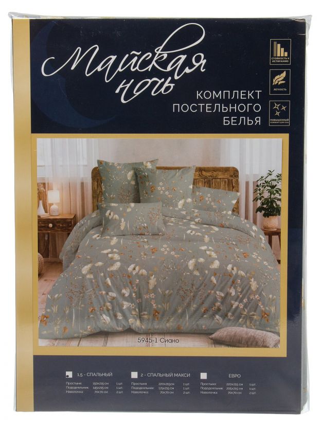 Постельное белье 1.5-спальное, простыня 150х215 см, 2 наволочки 70х70 см, пододеяльник 145х215 см, Майская ночь, бязь, Сиано