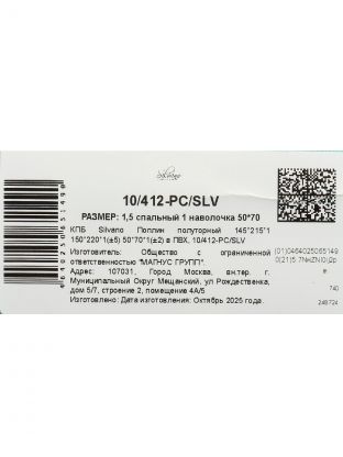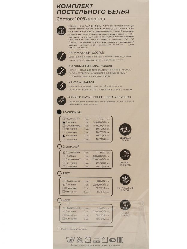 В комплекте пододеяльник 145x215 см, простыня 150x220 см, наволочка 50x70 см — стандартные параметры для 1,5-спального белья.
