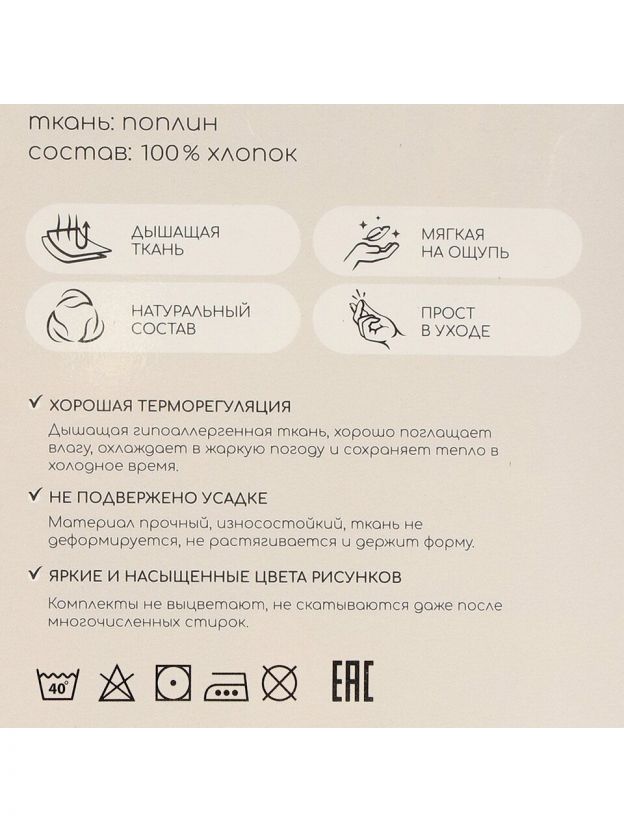 В отличие от аналогов из синтетики, хлопковый поплин приятен к телу, хорошо «дышит» и не вызывает раздражения даже при чувствительной коже. Комплект не содержит простыни, что удобно для тех, кто предпочитает использовать простыни на резинке или уже имеет подходящую по размеру. Часто спрашивают: подходит ли это бельё для подарка? — Да, благодаря стильной упаковке и универсальному дизайну комплект станет отличным презентом. Как использовать? Просто наденьте пододеяльник без застёжки — это ускоряет процесс смены белья.