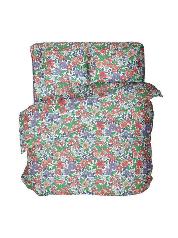 В комплекте простыня 180х220 см, пододеяльник 175х215 см, две наволочки 70х70 см — подходит для стандартных двуспальных кроватей.