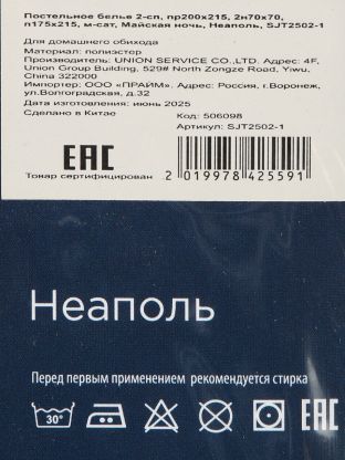 Постельное белье 2-спальное, простыня 200х215 см, 2 наволочки 70х70 см, пододеяльник 175х215 см, Майская ночь, микросатин, Неаполь, SJT2502-1
