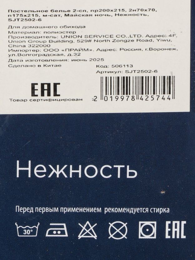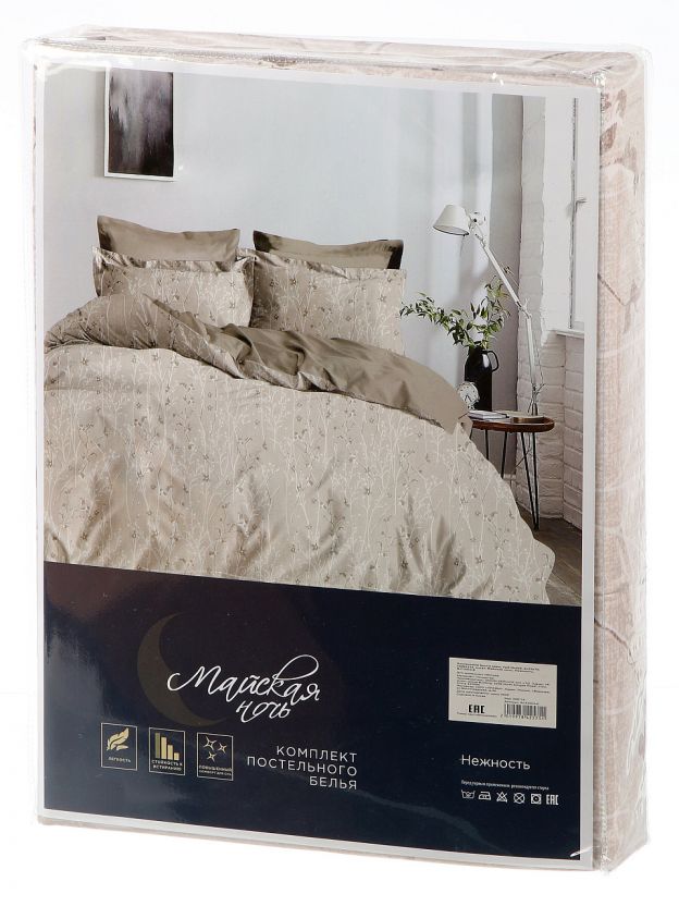 Постельное бельё «Майская ночь» (модель Нежность, SJT2502-6) — решение для тех, кто ищет купить недорого двуспальное постельное бельё из микросатина для дома или дачи. Микросатин — это современная ткань на основе полиэстера: она приятна на ощупь, не мнётся, не выцветает при стирке и быстро сохнет. Комплект рассчитан на стандартную двуспальную кровать, что облегчает выбор размера и делает его универсальным для большинства спален. Застёжка-молния на пододеяльнике упрощает смену белья и защищает наполнитель от выпадения.